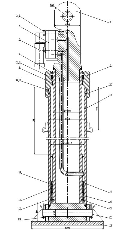 液壓支柱由1活柱、2螺栓、3彈墊、4液控單向閥、5安全閥、6防塵圈、7柱帽、8蕾形密封圈、9活塞桿導(dǎo)向環(huán)、10 O形圈、11擋圈、12(21)連接鋼絲、13油缸、14鼓形密封圈、15活塞擋圈、16下?lián)跞Α?7活塞導(dǎo)向環(huán)、18支撐環(huán)LW形、19底座、20蕾形圈用擋圈、22銷軸、23開口銷等零部件組成。(圖一)