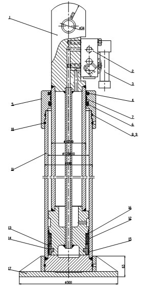 液壓支柱由1活柱、2液控單向閥、3安全閥、4防塵圈、5柱帽、6蕾形密封圈、7活塞桿導(dǎo)向環(huán)、8 O形圈、9 O形圈用擋圈、10連接鋼絲、11油缸、12鼓形密封圈、13活塞擋圈、14外卡鍵、15活塞導(dǎo)向環(huán)、16LW形支撐環(huán)、17底座零部件組成。